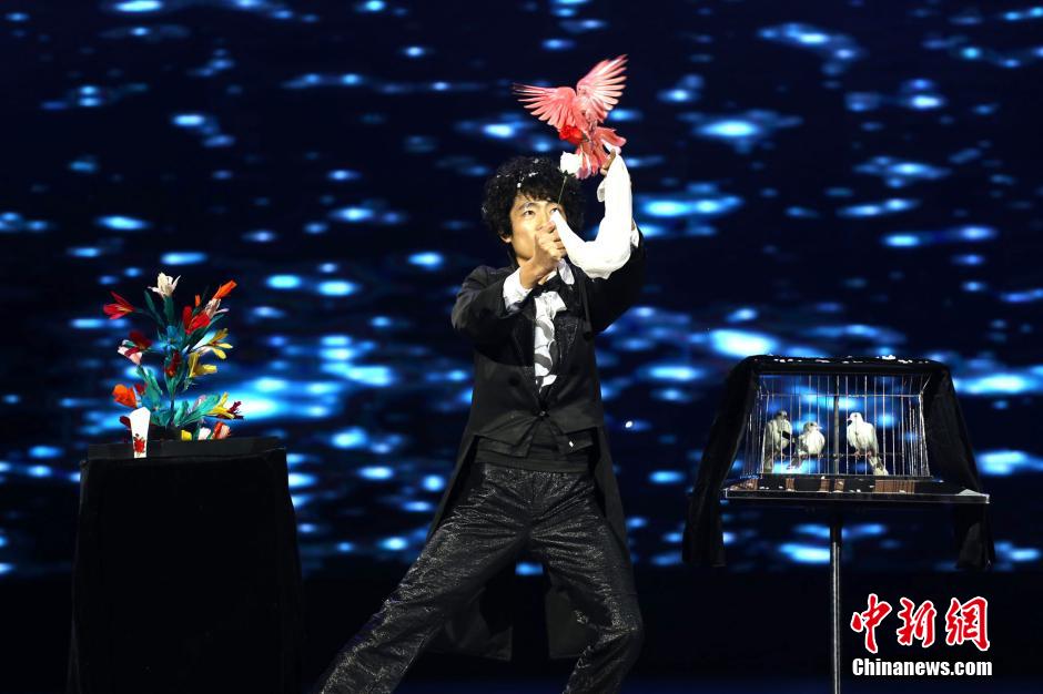 A magician from Baofeng, Central China's Henan province, performs Dream Flying Pigeon in the contest on the night of Oct. 15, 2014.[Photo/CNS]