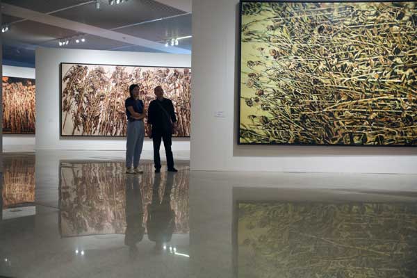 Artist Xu Jiang's new exhibition at the National Museum of China features sunflowers that are distorted, dark, withered and growing densely. [Photo by Jiang Dong/China Daily]