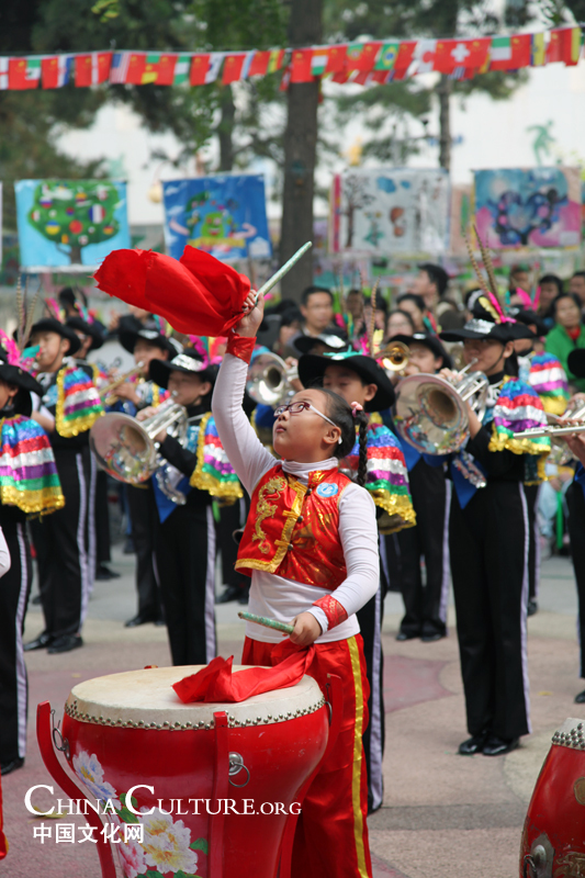Primary school students perform at the opening ceremony of the 6th World Children Calling for Peace Flag Painting Exhibition, Flag of Peace, in Beijing on Oct 25, 2014. [Photo by Liu Fang/Chinaculture.org]