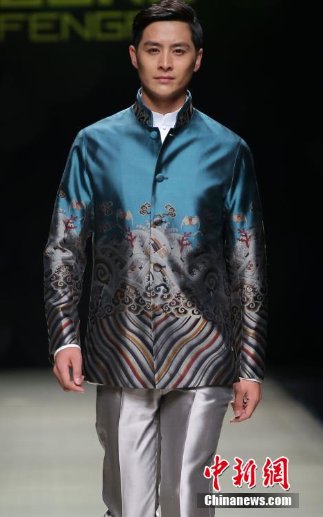 On Oct. 27, 50 works of designer Zeng Fengfei are displayed at China International Fashion Week in Beijing. He applied the design of Chinese costumes to his works which are made of cotton, cloud veil, Song brocade, etc.[Photo/Chinanews.com]