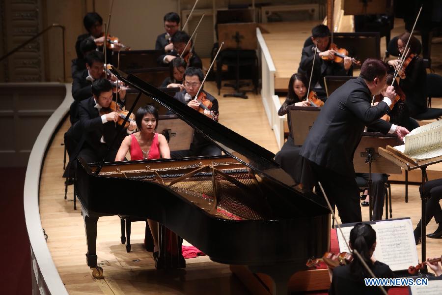 Young pianist Wang Yujia (L, front) performs with the China National Center for the Performing Arts (NCPA) Orchestra at Chicago Symphony Center in Chicago, the United States, on Nov. 2, 2014. The China NCPA Orchestra made the debut of its first-ever North America tour at Chicago Symphony Center on Sunday.[Photo/Xinhua]