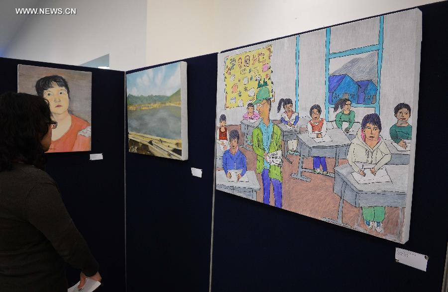 A visitor looks at a drawing on display during an exhibition featuring the works of Chinese disabled children, at the UN headquarters in New York, on Nov 3, 2014. [Photo/Xinhua]