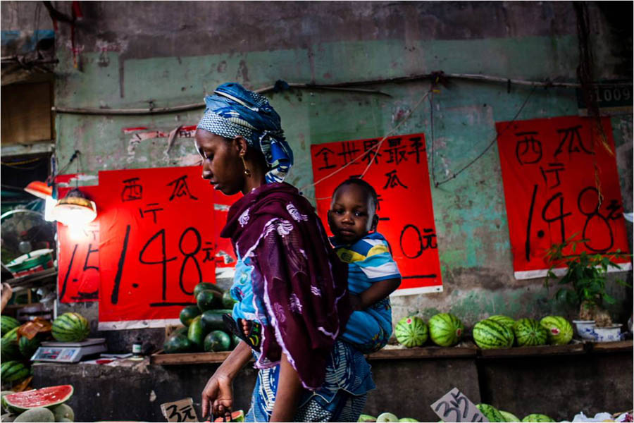 An African woman walks with a baby on her back. In a stretch of less than 200 meters of the Baohan Zhijie commercial district, there are two 300-square-meter supermarkets, one fish and meat market, and many open fruit stalls like this. [Photo by Li Dong/peopledaily.com]