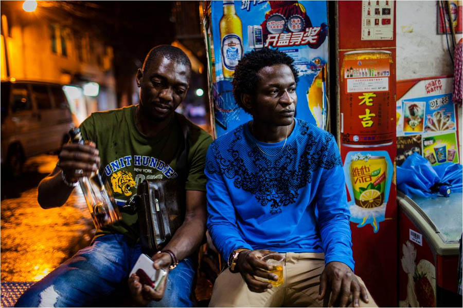 Sergei, a Nigerian, carrying whiskey hangs out with his friends in the street. He does not live in Baohan Zhijie, but he enjoys visiting his friends there. [Photo by Li Dong/peopledaily.com]