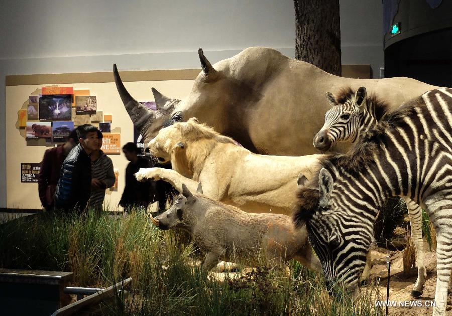 Visitors watch wild animal specimens donated by American philanthropist Kenneth E Behring at Shandong Museum in Ji'nan, capital of east China's Shandong Province, Nov. 25, 2014. [Photo/Xinhua]