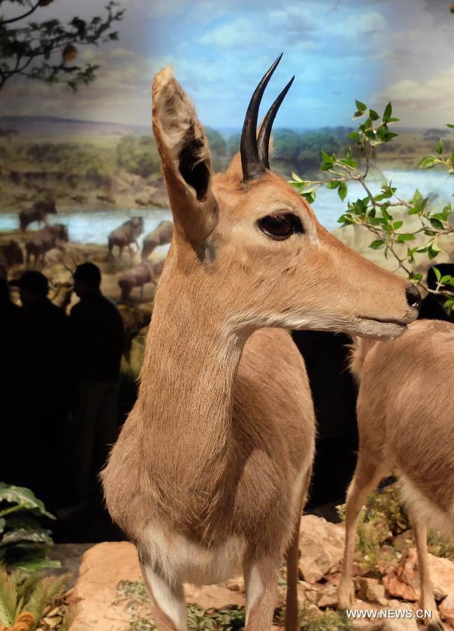 Visitors watch wild animal specimens donated by American philanthropist Kenneth E Behring at Shandong Museum in Ji'nan, capital of east China's Shandong Province, Nov. 25, 2014. [Photo/Xinhua]
