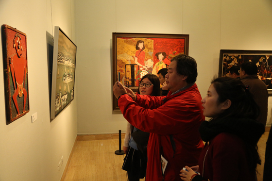 Visitors enjoy lacquer paintings displayed at the exhibition. [Photo/namoc.org]