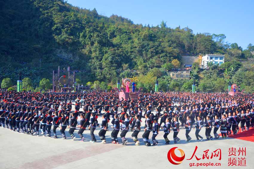 Nearly 10,000 Buyi people (an ethnic group living in south China) in national costumes danced together in Ceheng county, Southwest China’s Guizhou province on Nov. 29, 2014. A certifier from the Guinness World Record granted the certificate “Buyi bamboo drum dance and Zhuanchang dance Guinness world record” to this dance after the performance. (Photo source: gz.people.cn)