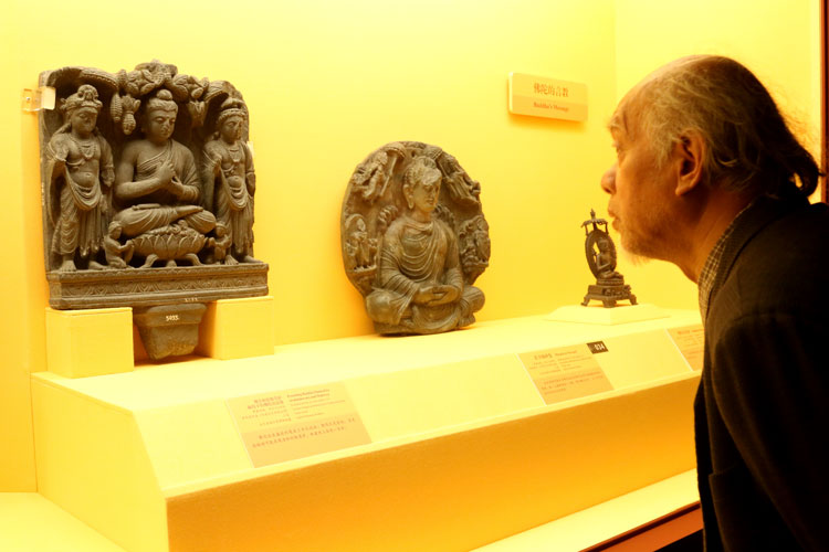 A vistor view the Buddhist artworks at Shanghai Museum. [Photo/CCTV.com]