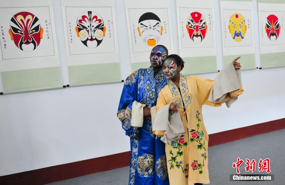 Photo taken shows two international students from the Republic of Congo, who are studying at University of Jinan in East China's Shandong province, performing the Peking Opera on Dec 10, 2014.