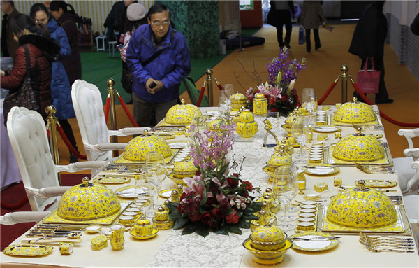 Tableware used during the APEC meeting are displayed at the 9th China International Cultural & Creative Industry Expo in Beijing on Thursday. [Photo by Zhu Xingxin/Asianewsphoto]