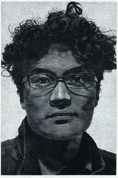 Peng portrays a Chinese man in a plaid shirt with curled hair and a fashionable pair of glasses. The young man's eyes in the woodblock are hardened by strong will and confidence yet betraying some confusion, a good example of China's young generation that usually grows up in a one-child family, writes the judge who voted to give it the gold award.