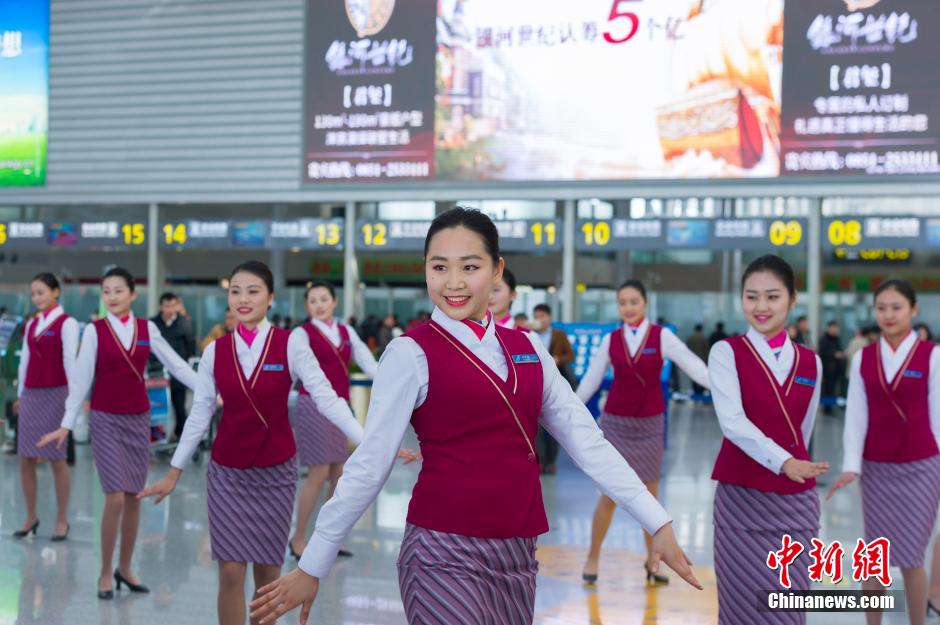 26 flight attendants perform flash mob in Longdongbao Airport Terminal in Guiyang, capital of southwest China's Guizhou province to welcome the upcoming new year on Dec. 22, 2014.[Photo/CNS]