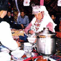 It is not without reason that milk tea is a daily drink among the minority peoples in Northwest China's Xinjiang Uygur Autonomous Region. In such a pasture area that is high in altitude and cold in temperature, a lot of meat with comparatively few vegetables is eaten. People in this area need to drink milk tea to get more minerals and to help with their digestion. Besides, the special drink can help them drive away cold in winter and heat in summer.