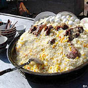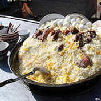 Shou Zhua Fan, or "rice eaten with hands," is another specialXinjiangcuisine -- rice cooked with fresh mutton, carrots, onions, vegetable oil, melted sheep's fat, and raisins, and so on. It is eaten with the hands, hence the name Shou Zhua Fan.