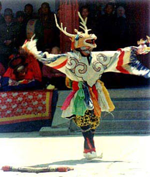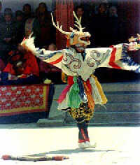 However, instead of absorbing the local Tibetan dances completely, Padmasambhava selected only some animal-mime dances and divine instrument dances that suited Buddhism and combined them with the ceremonial mask dance of the Bon religion. These dances and the Ox, Deer, and Dharma Protector dances, preserved to this day, trace back to the same origin.