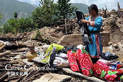 Qiang woman tidies up quilts dug out from the ruins of her village, destroyed by the earthquake