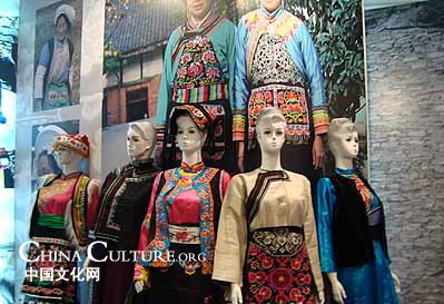 An exhibition of Qiang culture held in the Cultural Palace of Nationalities shows the beautiful clothes of the Qiang people