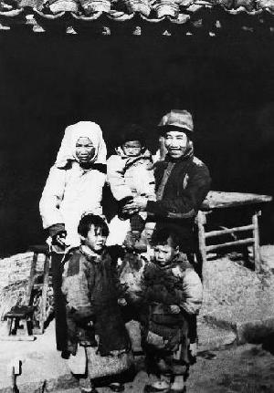 1950年,葉根土和妻子,二個(gè)兒子、一個(gè)女兒,一家5口身著破爛不堪的衣服在家門口合影。