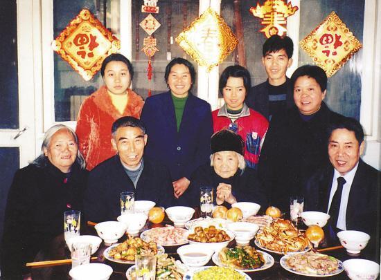 葉根土的妻子高阿二(中),和子女們一起坐在豐盛的餐桌旁,迎接2003年春節(jié)。