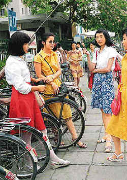 上世紀(jì)80年代,《街上流行紅裙子》大受追捧,一時(shí)間,色彩鮮艷的裙子成為大街小巷的女性追求時(shí)尚的標(biāo)志。這是1986年,北京街頭幾位穿著裙裝的姑娘在聊天(資料照片)。