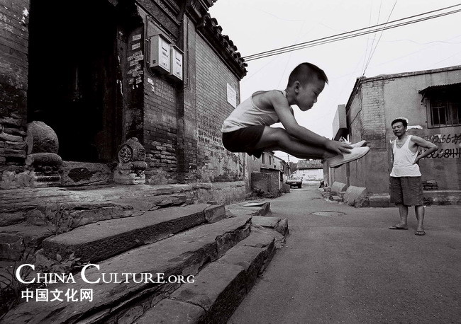 A boy jumps from a stairway at Caochang Sitiao hutong in Beijing in June 2006. Liu Yingyi/Beijing Traffic Management Bureau