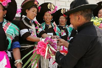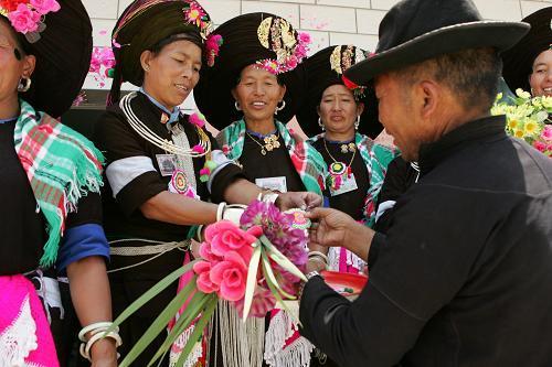 5月13日,德宏州隴川縣戶撒阿昌族鄉(xiāng)幾位阿昌族婦女向客人贈(zèng)送吉祥物