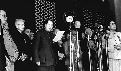 At 3:00 p.m., cheers resounded like rolls of thunder. Mao Zedong, followed by Zhu De, passed the old tile steps on the west side of the rostrum and stepped on Tian'anmen Rostrum first. After Lin Boqu declared the opening of the meeting, within the sound of the national anthem “March of the Volunteers”, the Central People’s Government’s chairman, vice chairmen and members filled their shoes. The people’s leader Mao Zedong solemnly declared: “The Central People’s Government of the People’s Republic of China has been founded!” The resonant voice shook the whole Beijing City, the whole China and the whole world, marking an epoch of the Chinese people of all ethnic groups.