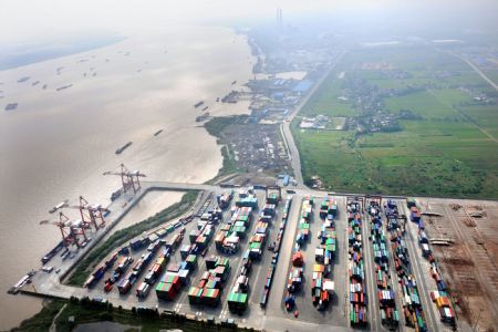 The aerial picture taken on Sept. 19, 2009 shows the container dock of Yangzhou City, east China's Jiangsu Province.