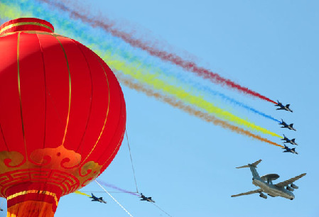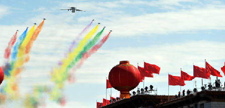 The leading formation of planes fly over the Tian'anmen Square in the celebrations for the 60th anniversary of the founding of the People's Republic of China, in central Beijing, capital of China, Oct. 1, 2009.(By Xinhua/Jin Liangkuai)