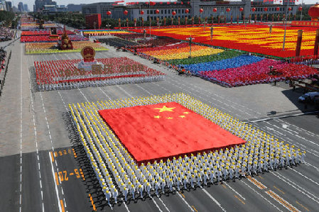 Paraders carrying a 28.8-meter long and 19.2-meter wide national flag, the largest-ever displayed during China's national day parades, march through Tian'anmen Square during a mass celebration of the 60th founding anniversary of the People's Republic of China on Tian'anmen Square, in Beijing, October 1, 2009. [Xinhua]