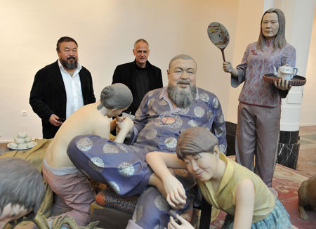 Curator Ai Weiwei (L), Luc Tuymans pose for photos at "The State of Things -- the Chinese and Belgian artists' exhibition", a part of the Europalia Chinese Art Festival, in Brussels, capital of Belgium, Oct. 16, 2009. (Xinhua/Wu Wei)