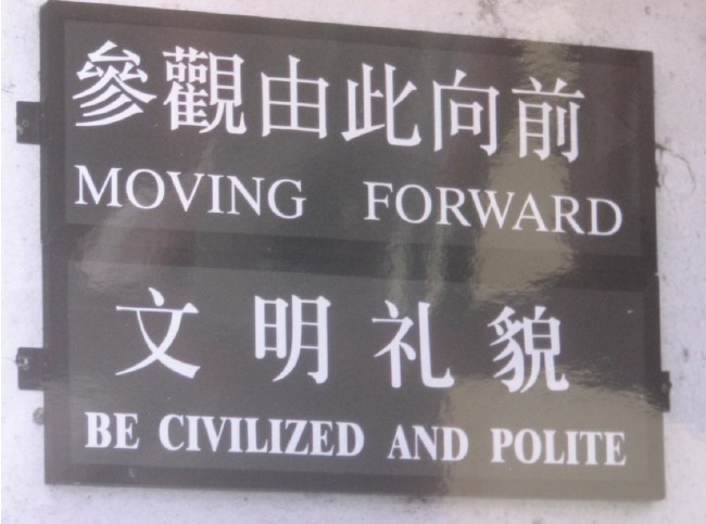 Instruction panels like this “Moving Forward, Be Civilized and Polite” are an outward sign of this solidarity. Everybody is equal and urged to treat others well. While set apart those words are sensible, a juxtaposition like this trigger a tide of associations. Is this a precise translation? Is this really about being civilized? And when does politeness become important in the process of evolution? And is being Civilized and Polite a developed form of Moving Forward?