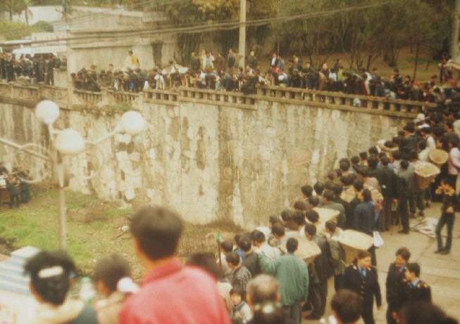 Chinese people are very curious. In this picture we see a crowd gathering on the bridge and along the bank. See how close they stand to each other in two and three rows! On the right side we see three policewomen. On the left side, in the middle, we see the focus of attention – a man laid down on a stretcher, supposedly fallen from a high crane which is left – out of the picture.