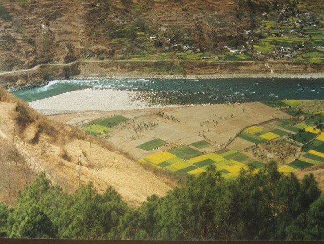 The blossomy fields in the picture are from a bus trip from Chengdu. After a while of winding through the mountains a road broke free in the vast. A colourful valley, reminding of Cezanne’s canvases with its bright yellow and green lots of land. A river of blue, from dark blue in the deep to the quiet murmur of rapids promised by the white foam but not heard because of the distance. The freshness of air brought along by the stream driving waters from the mountains, only imaginable while sitting in the stuffed minibus with closed windows.