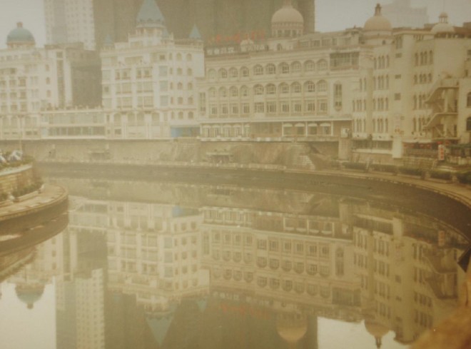 In the bend of the river we see a string of buildings. The regular rhythm of rounded window openings makes us imagine we’re in Saudi Arabia. The imposing cupolas on the roofs add an eclectic touch to create the impression we’re in Las Vegas. However, the dark silhouette in the background, a volume of a new building reaching up to the skies reminds you – you are in China, the fastest growing country in the world.