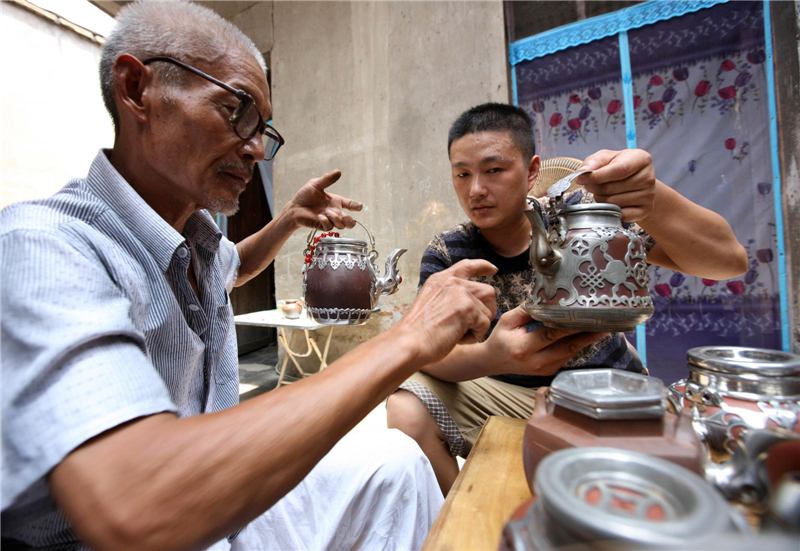 Chen Baoyu (R) learning the technique of making tin pots from his father, Chen Xinghai, near the city of Bozhou, Anhui province, July 28, 2013. [Photo/Xinhua]