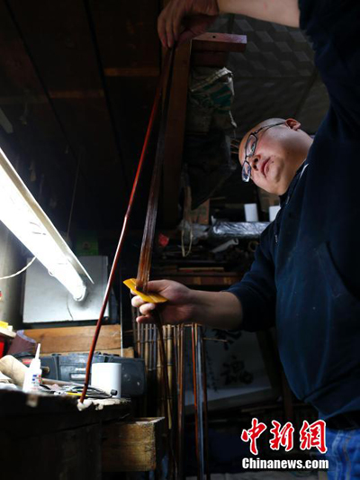 Xu Yidong, 28, has been learning to make Jinghu, a Chinese bowed string instrument used in Peking opera, from his grandfather, a master Jinghu artisan, for more than nine years. (CNS Photo/ Fu Tian)