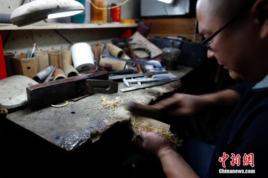 Xu Yidong, 28, has been learning to make Jinghu, a Chinese bowed string instrument used in Peking opera, from his grandfather, a master Jinghu artisan, for more than nine years. (CNS Photo/ Fu Tian)