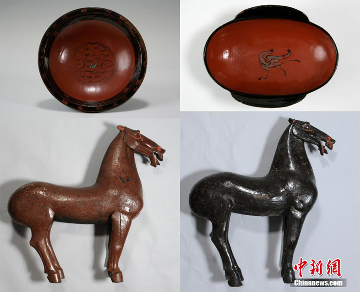 Over 240 lacquer wares are unearthed, including earrings, jewelry boxes, plates, cases, tomb figures and horses. (Photo provided by Chengdu Institute of Cultural Relics)