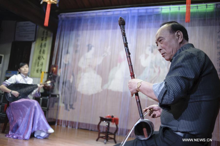 Xia Yongxi(R), an inheritor of Nanyin, an ancient Chinese folk music art form originated from southeast China's Fujian province, plays erxian, a two-stringed instrument, at a tea house in Quanzhou, Fujian province, May 8, 2014. Nanyin, known as the "living fossil" of ancient Chinese music, literally means music in the south and is a traditional opera in Fujian dialect. Nanyin was spread to Southeast Asia and also introduced to Europe and America by thousands of overseas Chinese, when the Maritime Silk Road flourished during ancient China's Song(960-1279) and Yuan(1271-1368) Dynasties. In 2006, Nanyin was enlisted as a National Non-material Cultural Heritage. Three years later, it was listed as a World Human Verbal and Intangible Cultural Heritage by UNESCO. [Xinhua/Jiang Kehong]
