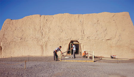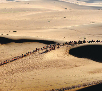 Tourists take a camel ride to explore the Gobi desert in Dunhuang, a key stop on the ancient Silk Road. Provided to China Daily