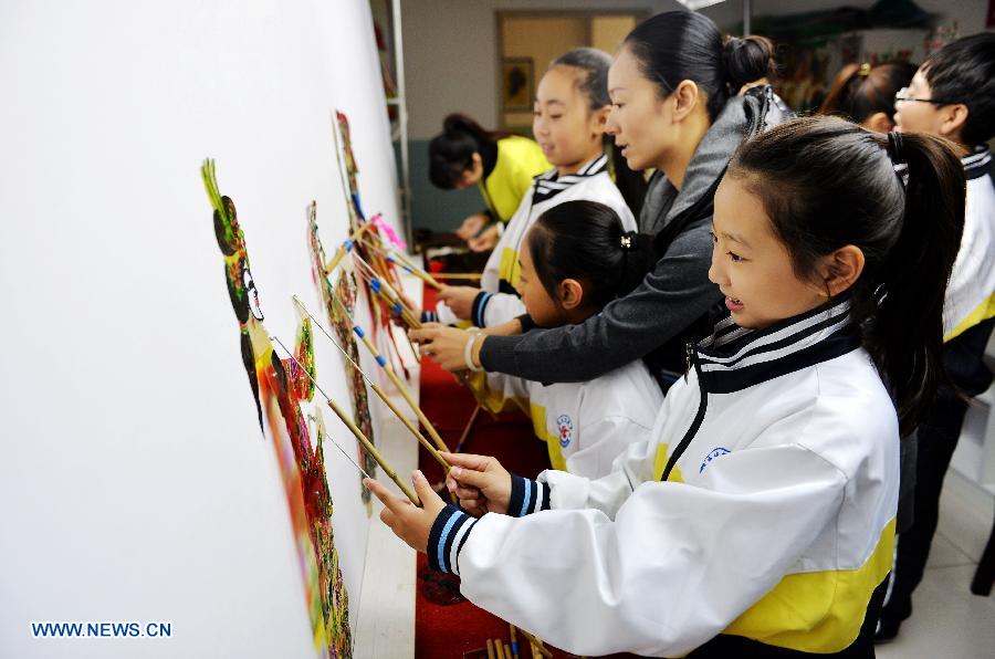 Students learn to make shadow puppets in Luanxian county, North China's Hebei province, Oct23, 2014. Shadow play, or Shadow puppetry, is an ancient form of storytelling and entertainment using opaque, often articulated figures in front of an illuminated backdrop to create the illusion of moving images. [Photo/Xinhua]