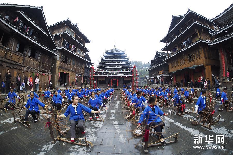 More than 100 women of Dong ethnic minority demonstrated their traditional textile technique to tourists in Sanjiang Dong Autonomous County of south China's Guangxi Zhuang Autonomous Region on Nov. 15, 2014.
