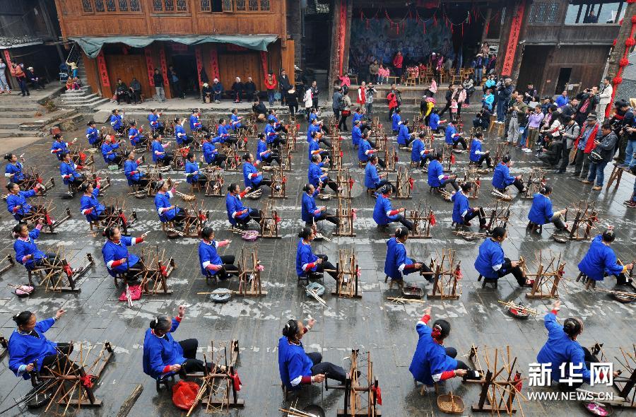 Women of Dong ethnic minority demonstrate the traditional textile technique in Sanjiang Dong Autonomous County of south China's Guangxi Zhuang Autonomous Region on Nov. 15, 2014.[Photo/Xinhua]