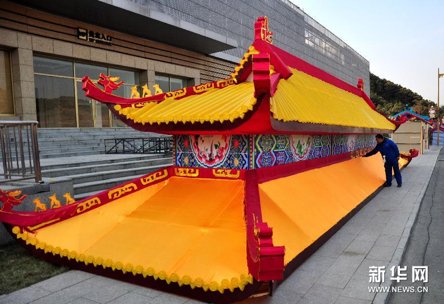 A staff worker examines a large-scale lantern at Royal Square in Chengde city, North China's Hebei province, Nov 25, 2014. [Photo/Xinhua]
