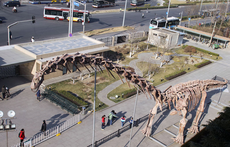 A restored dinosaur skeleton is on display outside the Beijing Museum of Natural History on Tuesday.[Photo by Zou Hong/Asianewsphoto]