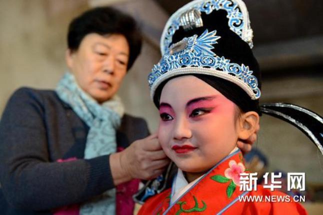 A child actor from Hongxing Children's Pingju Troupe is making up on Nov 3, 2014. To carry on Tangshan Pingju, one of the Chinese national level intangible cultural heritages, Hongxing Children’s Pingju Troupe was established by artist Hong Ying under the support of local government in Tangshan city of North China’s Hebei province in 2011. For three years, the troupe has cultivated more than 30 children performers, whose performances are well received among the local people. [Photo/Xinhua]