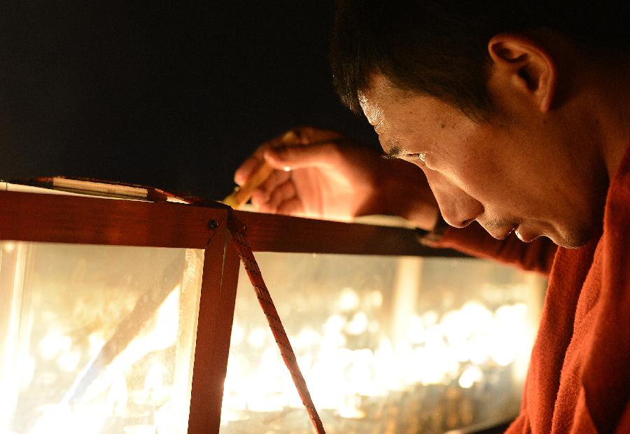 A monk lights a butter lamp on the roof of the Jokhang Temple on the Butter Lamp Day, a festival to commemorates Tsong Khapa, a master of Tibetan Buddhism, in Lhasa, capital of Southwest China's Tibet autonomous region, Dec 16, 2014. [Photo/Xinhua]