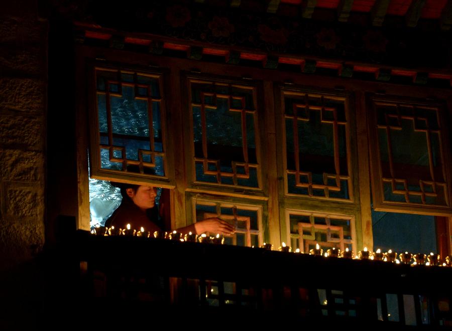 A pilgrim lights a butter lamp on the Butter Lamp Day, a festival to commemorates Tsong Khapa, a master of Tibetan Buddhism, in Lhasa, capital of Southwest China's Tibet autonomous region, Dec 16, 2014. [Photo/Xinhua]
